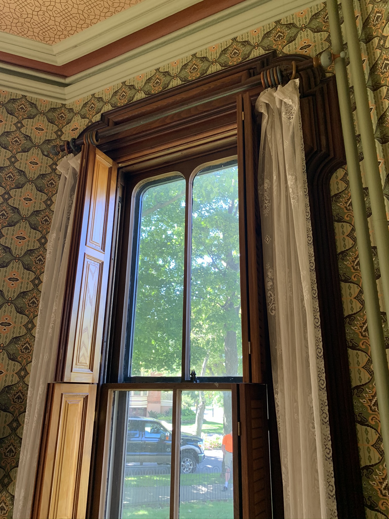The original electrolier (chandelier) was installed in 1893 when the house was wired for electricity and hangs in the middle of the original ceiling medallion. The curtain rods with colored rings seen above the bay window are original to the home.