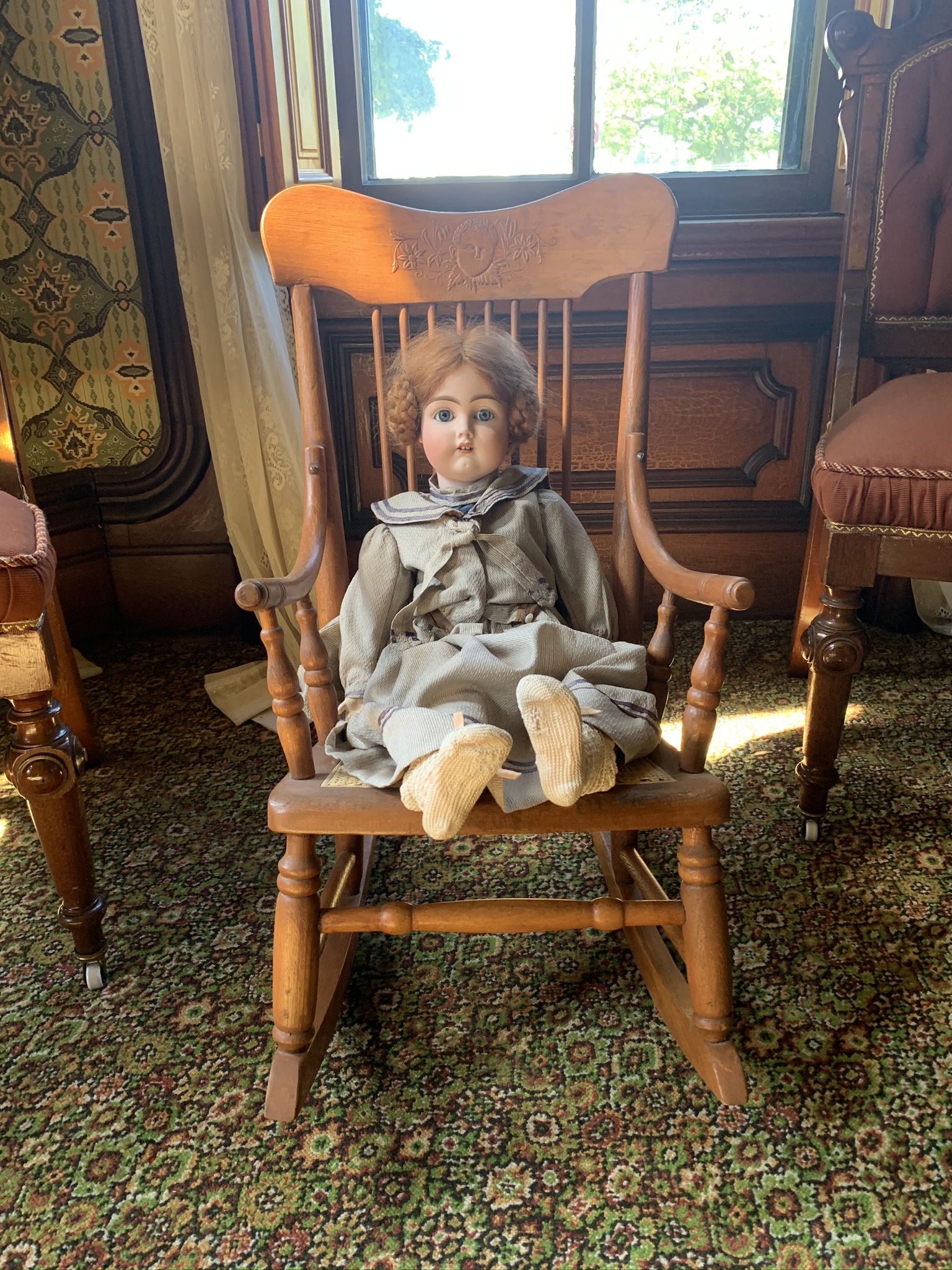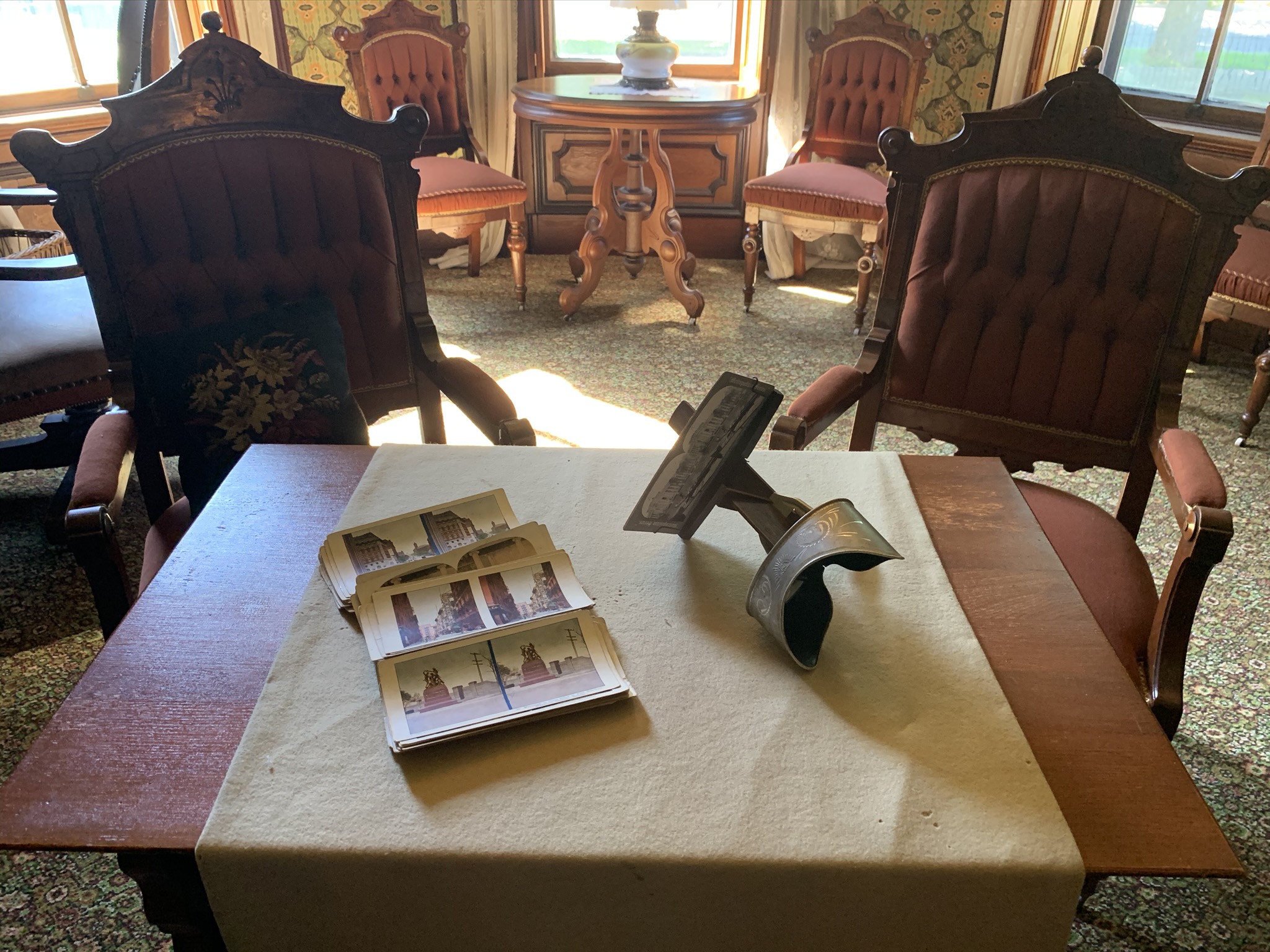 The stereoscope on the center table was an early way for people to see far away places and other cultures in a time before television, video, and even printed magazines. The doll sitting on the rocking chair is named Rose and belonged to Ida Cappon. The rocking chair was Ida’s as a child and was returned to the home after Ida’s death in 1992.