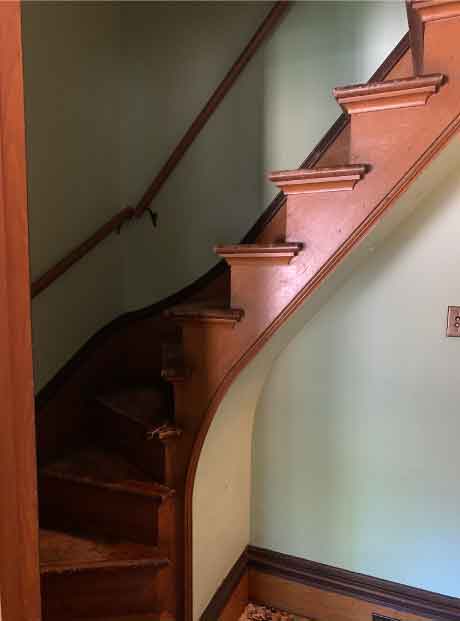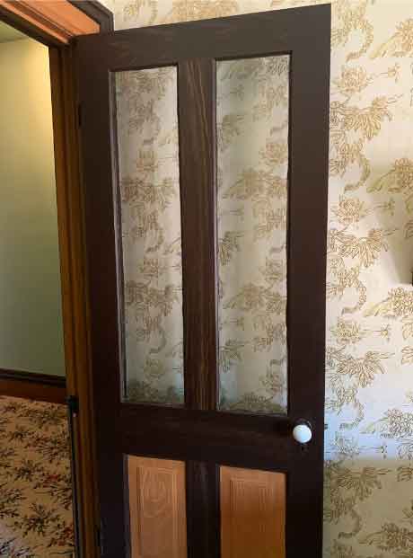 The door to this bedroom contains glass panels which let window light into the otherwise dark back hallway. The winding stairway opposite the bedroom door leads to the main attic which is a large storage space with no windows. There are stories of the Cappon children playing in the attic on rainy or cold days.