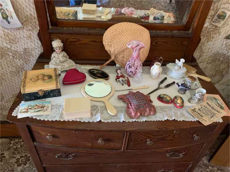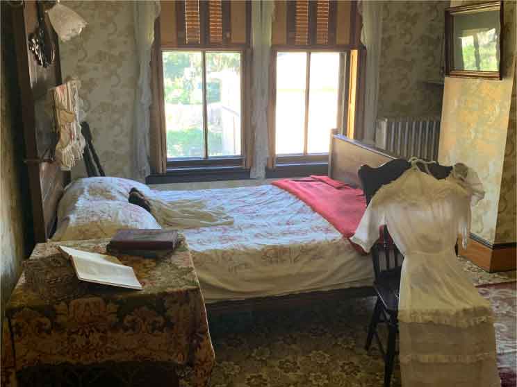 Although this bedroom was used by several of the family’s daughters and was Lavina’s most of her life, it was most probably occupied by Ida and Lavina Cappon (age 9 and age 6) in 1900. It is thought that the dresser, bed, and washstand were made by the Holland Furniture Company around 1900, and replace the original bedroom set for this room which was not found among the Cappon belongings. Original wallpaper, ingrain carpet and curtains have been reproduced. Cappon pieces in this room are the pictures on the walls, the chairs, and the items on the dresser.