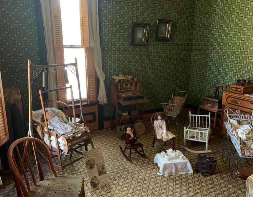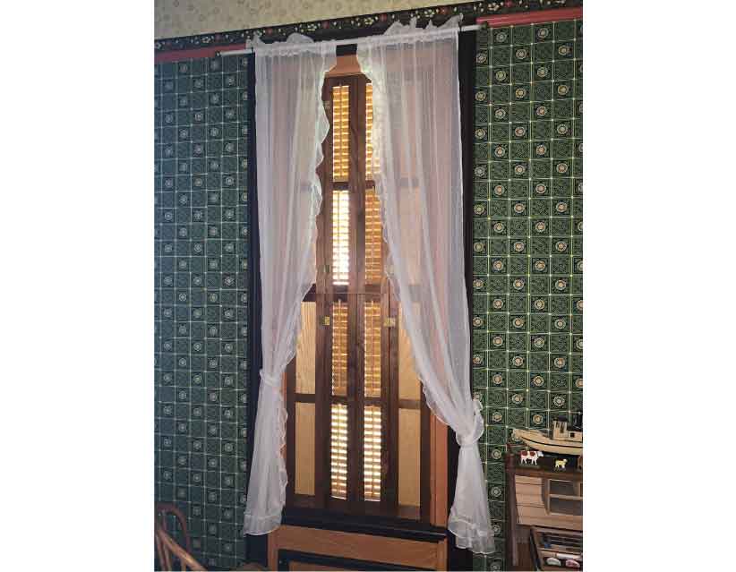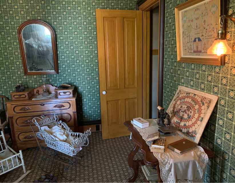 When Isaac Cappon died in 1902, the five children of his second wife ranged from one to ten years of age. The children used this room for play. Toys found in the Cappon House and from the Holland Museum collection are displayed here. The curtains are reproductions of original dotted swiss curtains and hang from original curtain rods. The wallpaper is a reproduction of a late 1800s pattern from a house in Marshall, Michigan. At other times in the home’s history, this room was used as a bedroom.