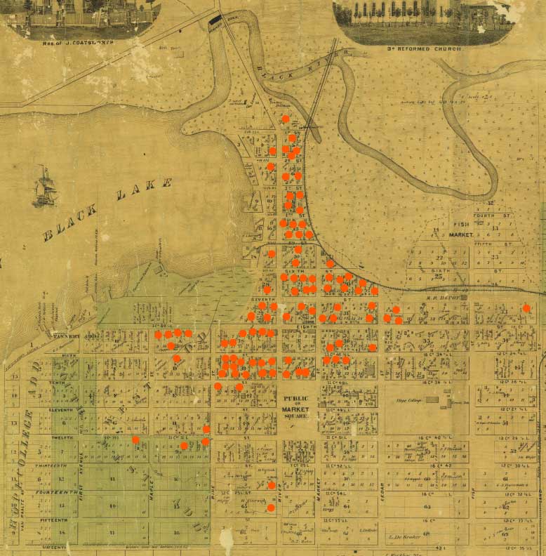 In 1871, Centennial Park was an open market space. During the fire, people used the area to pile their belongings, hoping the park would be spared from the flames. Some also tried burying their possessions here trying to protect their things from the flames. People fleeing Holland also buried their possessions in the sand by the lake. Many watched from boats on Black Lake as the city burned in the darkness. One newspaper account reported that six people had walked to Grand Rapids from Holland, fleeing the fire and looking for shelter with friends. Click for larger picture