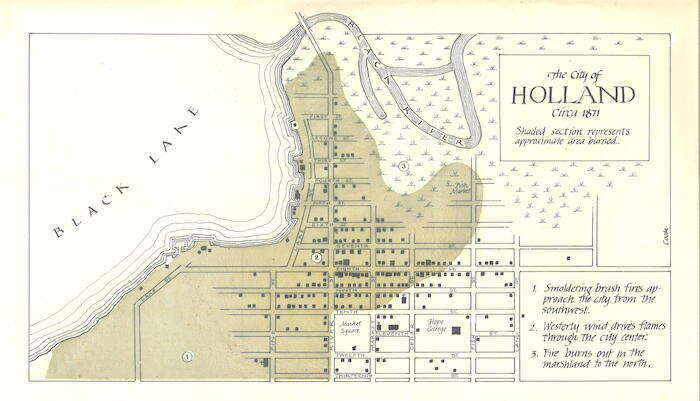 Many Holland residents believed that the fire was a punishment from God because there were several fires across the Midwest and because so many churches burned. On October 12, 1871, a joint issue from all three Holland newspapers reported: “The Almighty has spoken, and the carrying out of His voice is powerful. Our dear city of Holland is said to be no more.” Click for larger picture